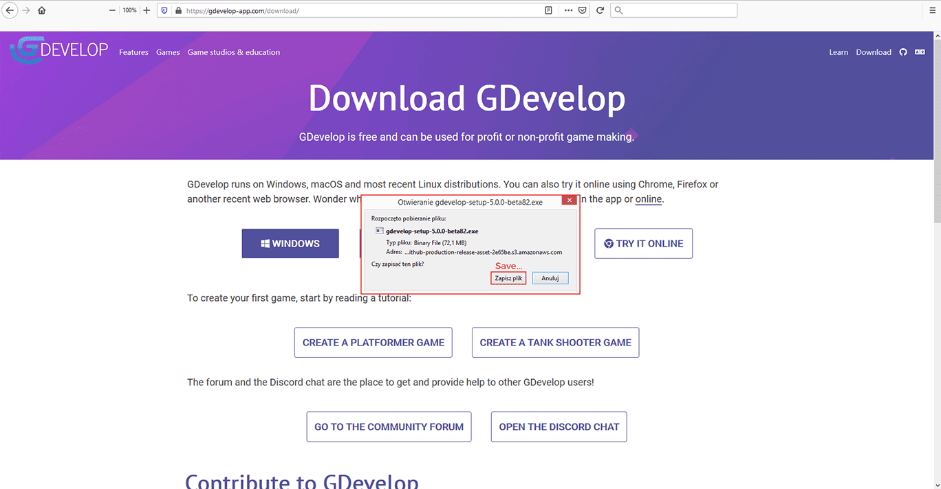 Para obtener su copia de GDevelop puede visitar la Página de descarga en donde están disponibles las distribuciones para Windows, Mac OS, and Linux.