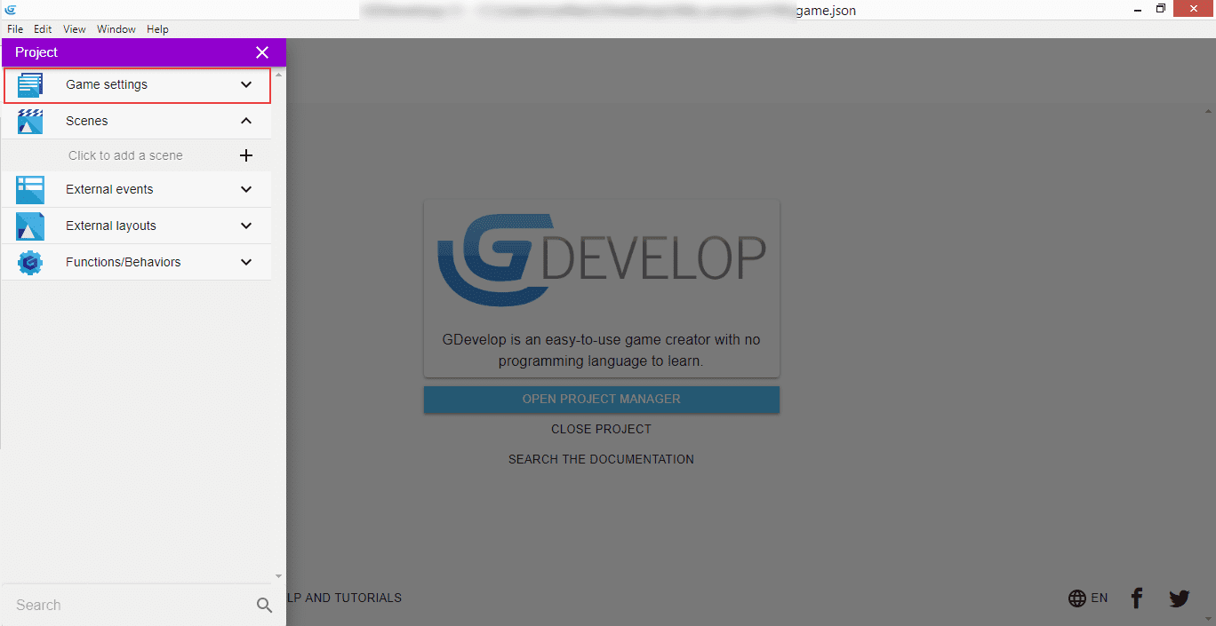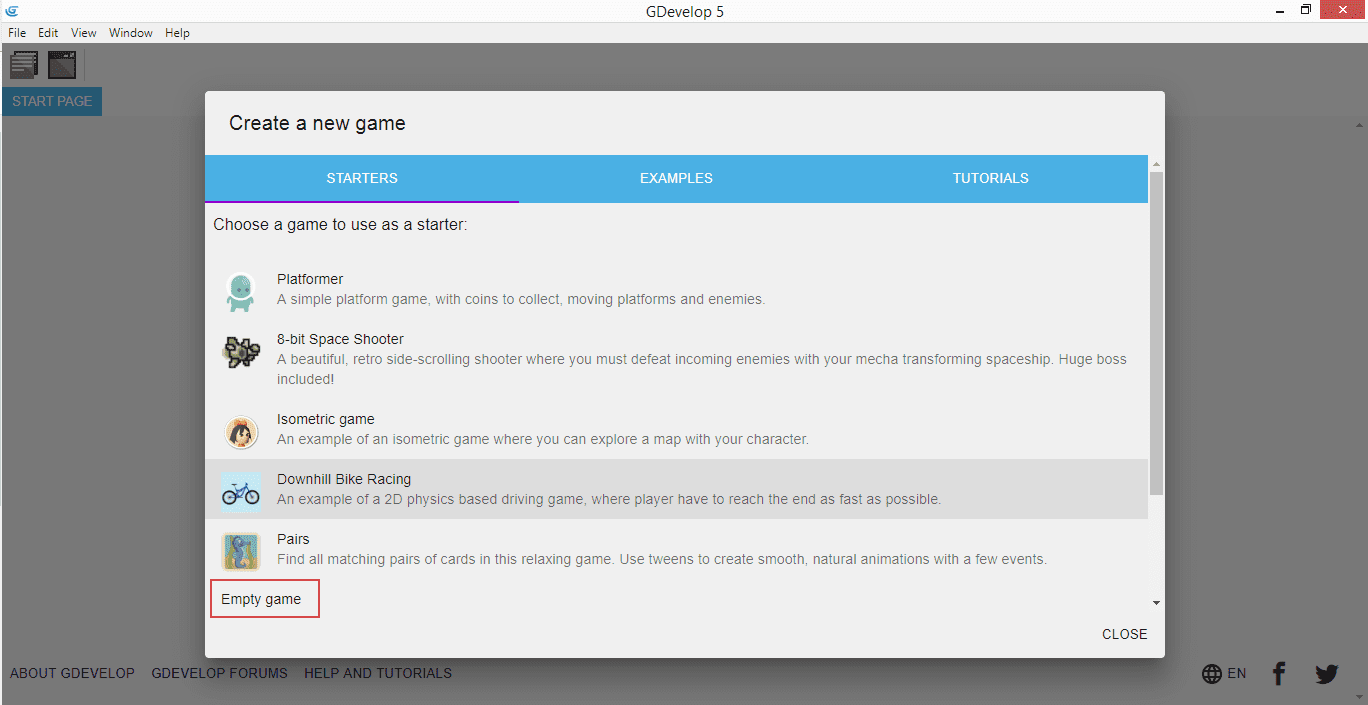 Espere hasta que se complete el proceso, navegue hasta donde están instalados todos sus nuevos programas y haga doble clic en la aplicación GDevelop para iniciar el editor. Serás recibido con la pantalla de bienvenida en la página de inicio.