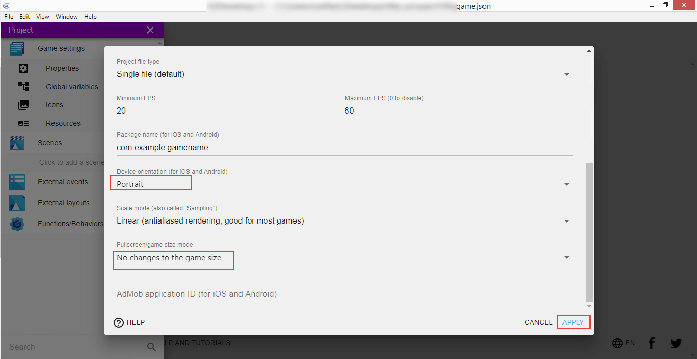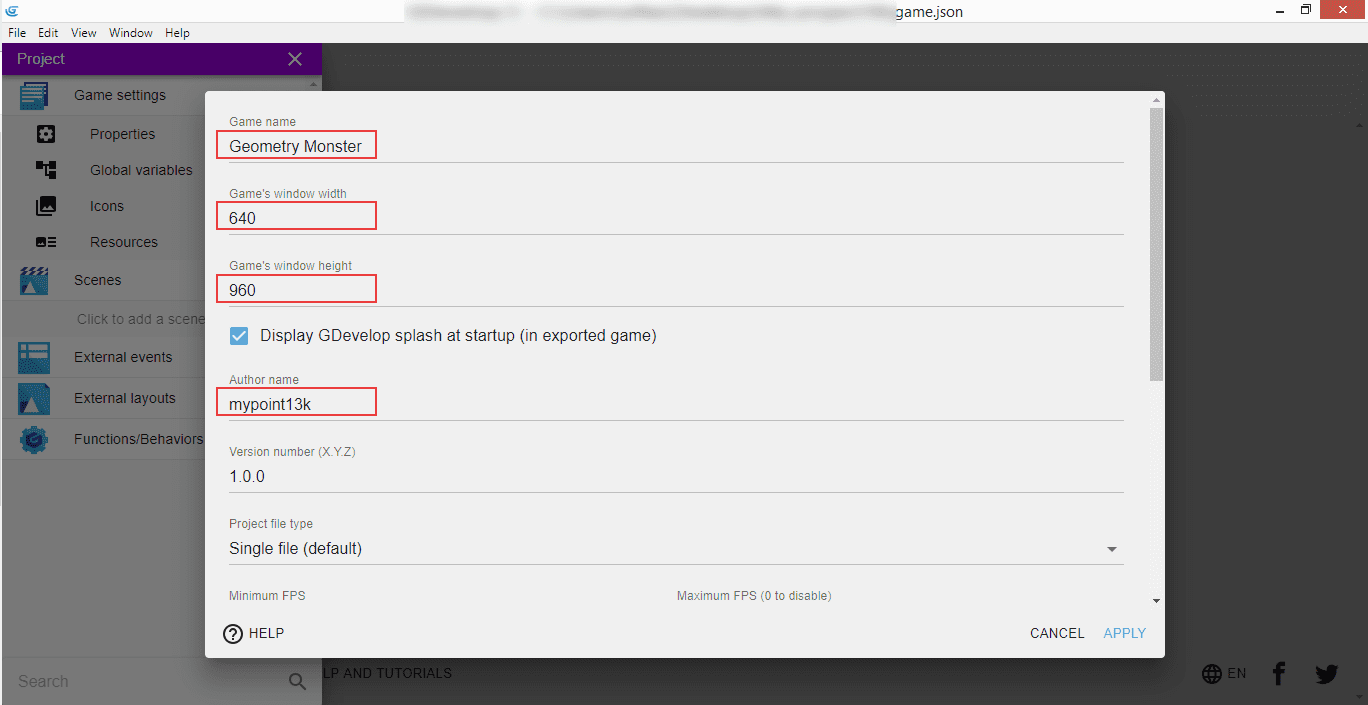 El nombre de nuestro juego es "Monstruo Geométrico", el tamaño de la ventana es de 640 píxeles de ancho y 960 píxeles de alto; esto creará un área de juego que se adapta al modo retrato en un dispositivo móvil que confirmaremos en un segundo. Puedes ingresar tu nombre o apodo en el campo "Autor" abajo.