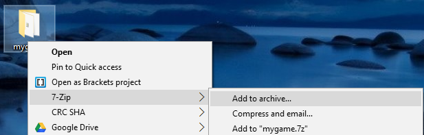 Pour compresser le dossier au format ZIP, vous aurez besoin d'un logiciel de compression. Il en existe de nombreux. En voici un très couramment utilisé : 7-Zip, il est complètement gratuit et facile à utiliser. Téléchargez donc 7-Zip et installez-le. Une fois cela fait, faites un clic droit sur le dossier contenant votre jeu : vous devriez voir apparaitre 7-Zip dans la liste des choix. Cliquez sur "Ajouter à l'archive".