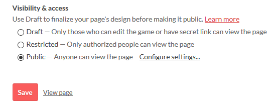La dernière chose restante à faire est à présent de rendre le jeu public afin que tout le monde puiss y jouer. Pour faire ceci, cliquez sur le bouton "Edit game" en haut (ou retournez sur le Dashboard) La page de création de projet va s'ouvrir, et vous pourrez activer l'option afin de rendre votre jeu public.