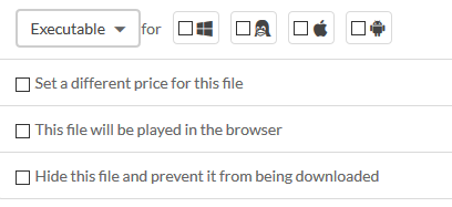 Vous pouvez choisir si le fichier que vous venez de charger est un exécutable, un livre, un code source ou un mode. Vous pouvez également choisir la plateforme et le prix pour chaque fichier que vous aurez chargé. L'option la plus importante pour nous dans notre exemple est "This file will be played in the browser".