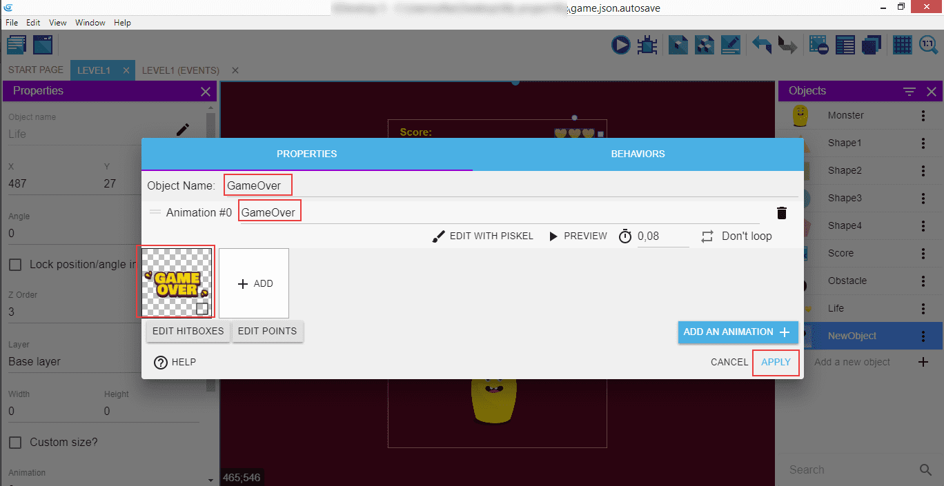 Appelez-le GameOver, ajoutez l'image respective et enregistrez-la.