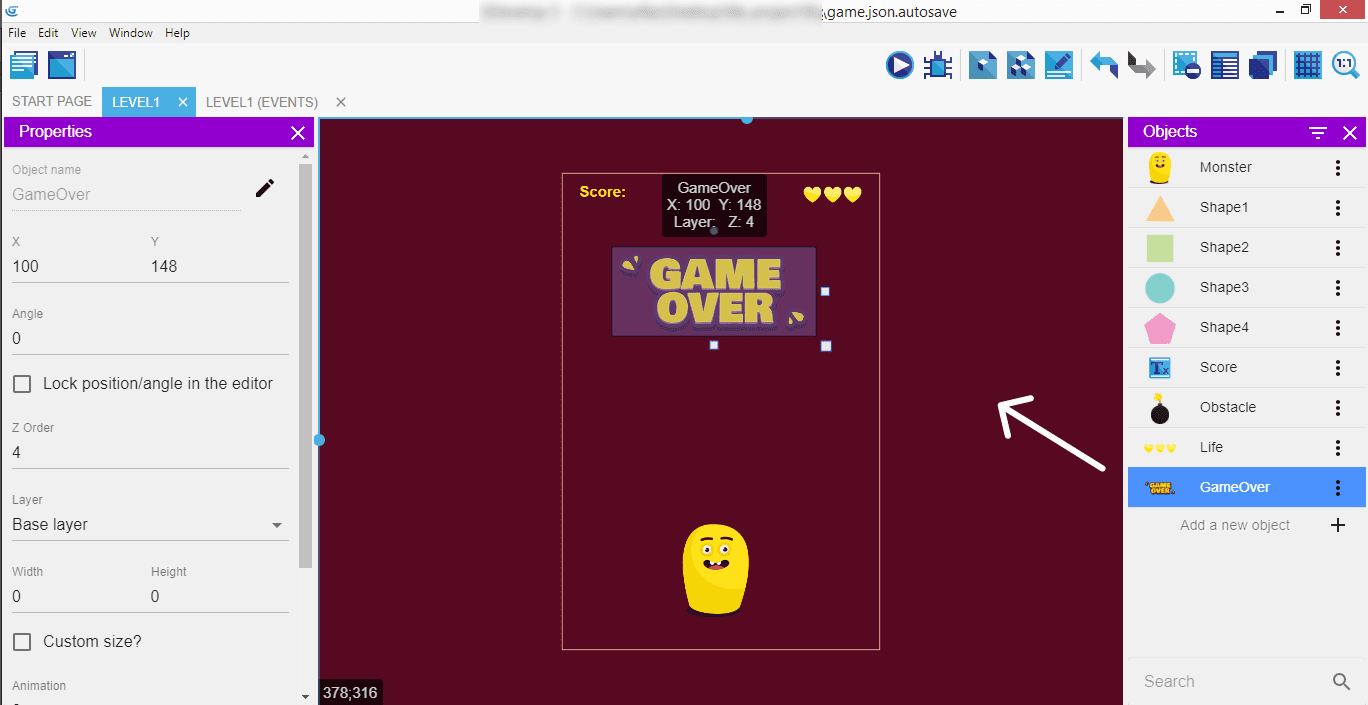 Sélectionnez ensuite le sprite GameOver et affichez-le à l'écran avec Show.