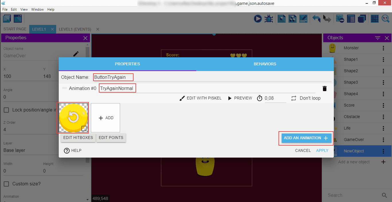 Ajoutez un autre sprite, qui sera le bouton permettant de rejouer. Nommez-le ButtonTryAgain (Bouton réessayer) et nommez l'animation TryAgainNormal pour l'état du bouton par défaut. Importez l'image.