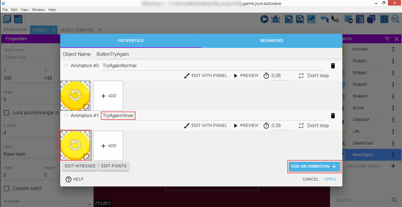 Ajoutez une deuxième animation appelée Try AgainHover (RéessayerSurvol) qui sera utilisée pour indiquer que l'utilisateur a positionné le curseur de la souris sur le bouton.