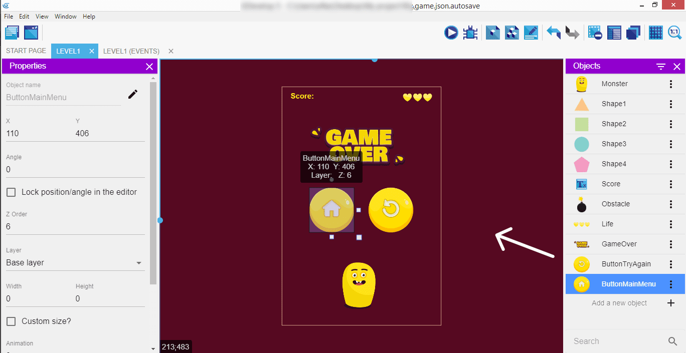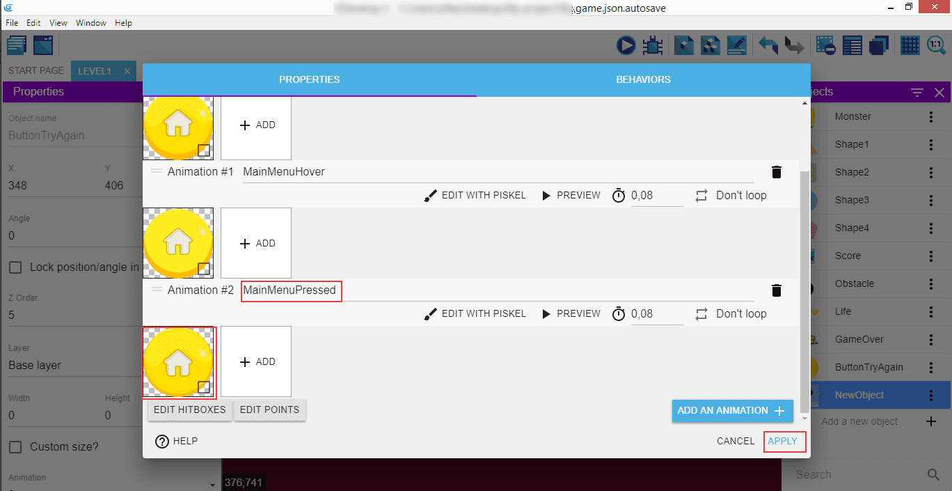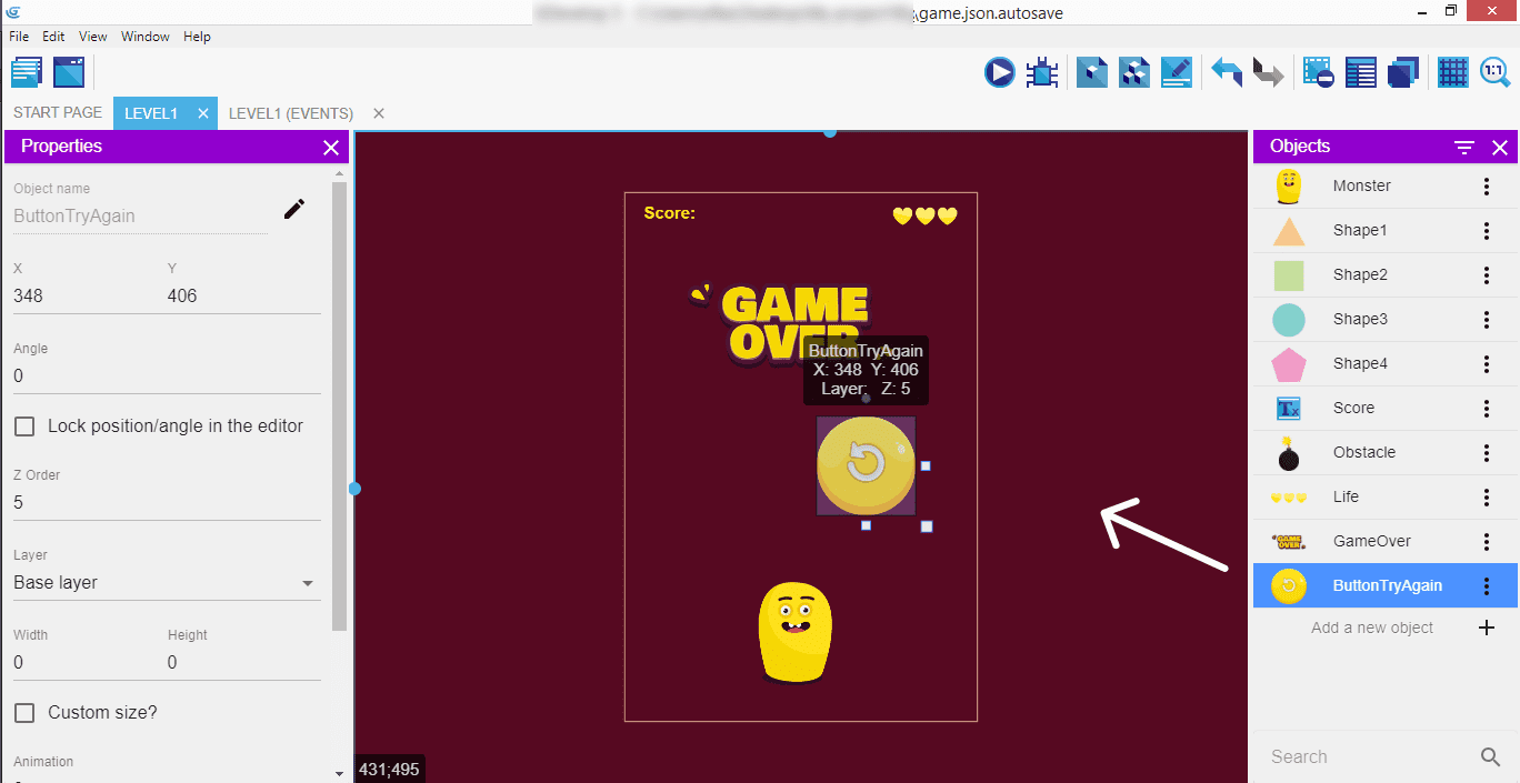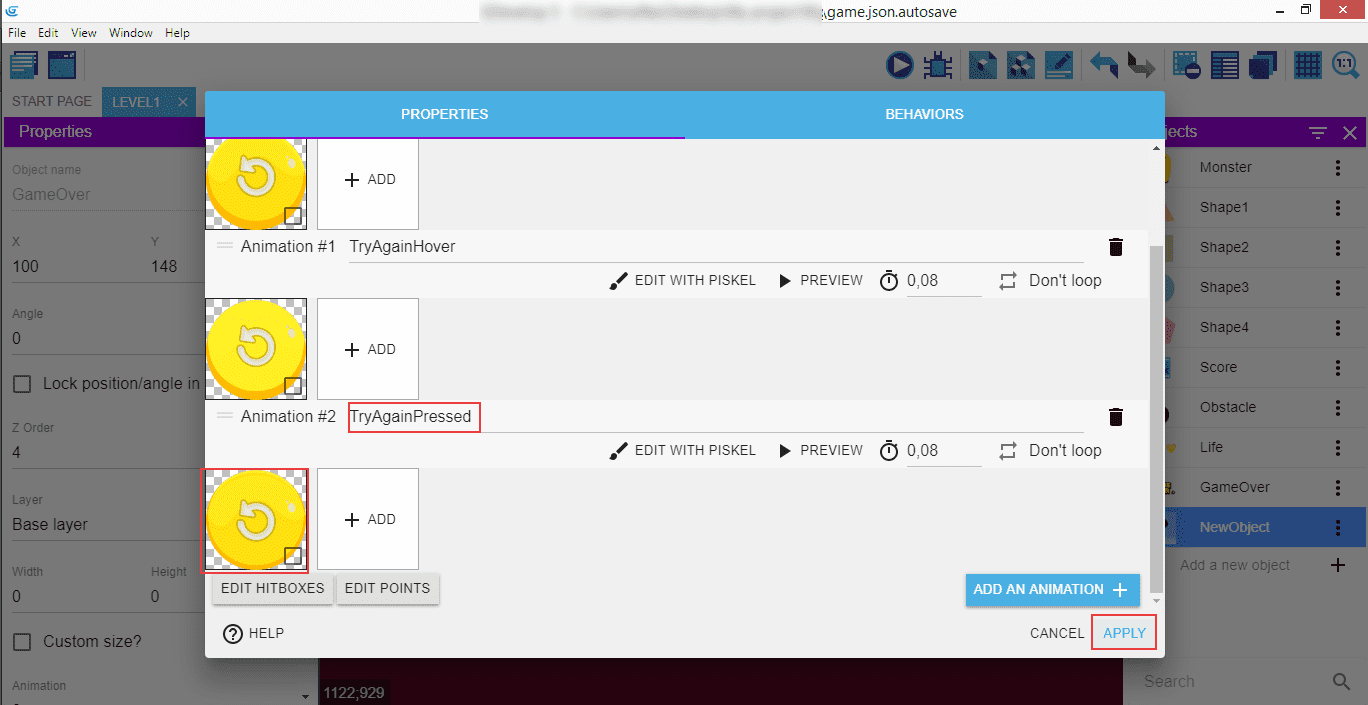 Faites de même pour le sprite ButtonTryAgain ...