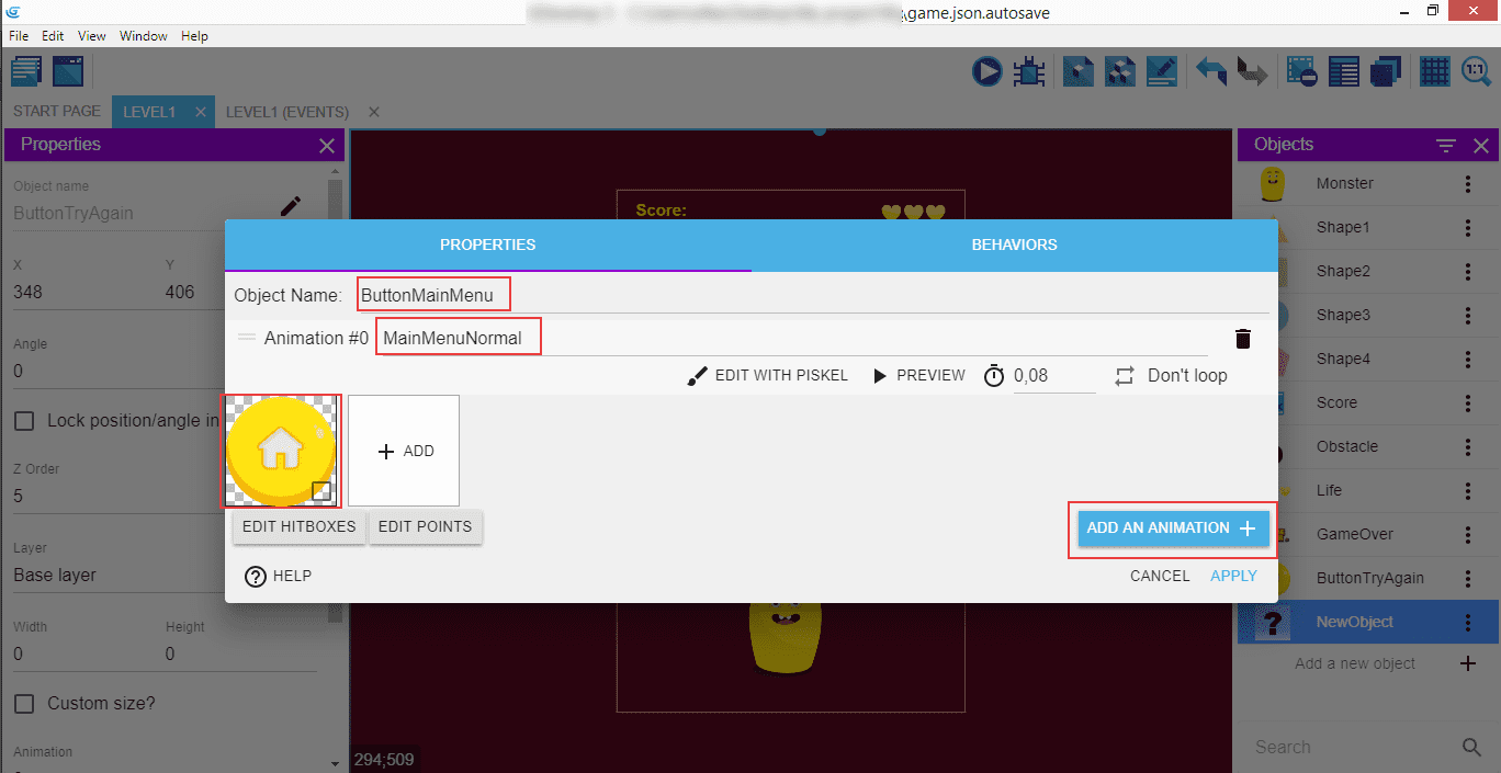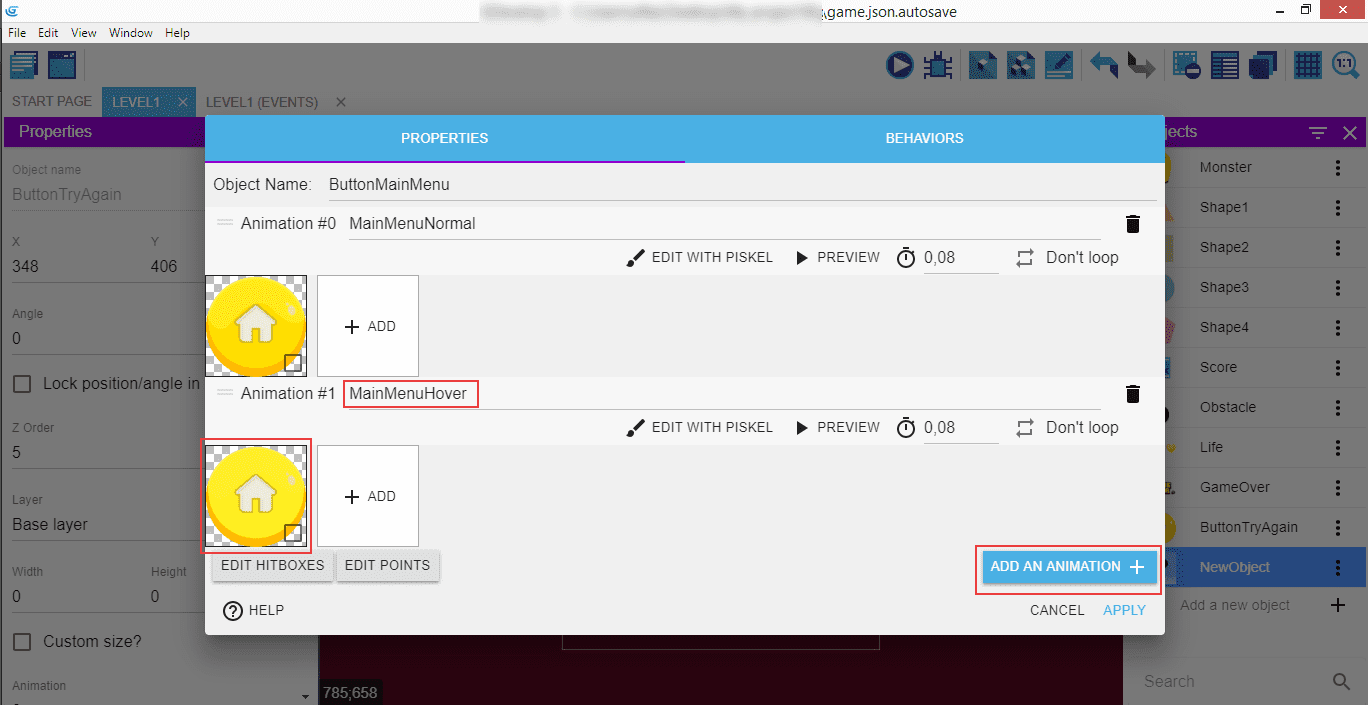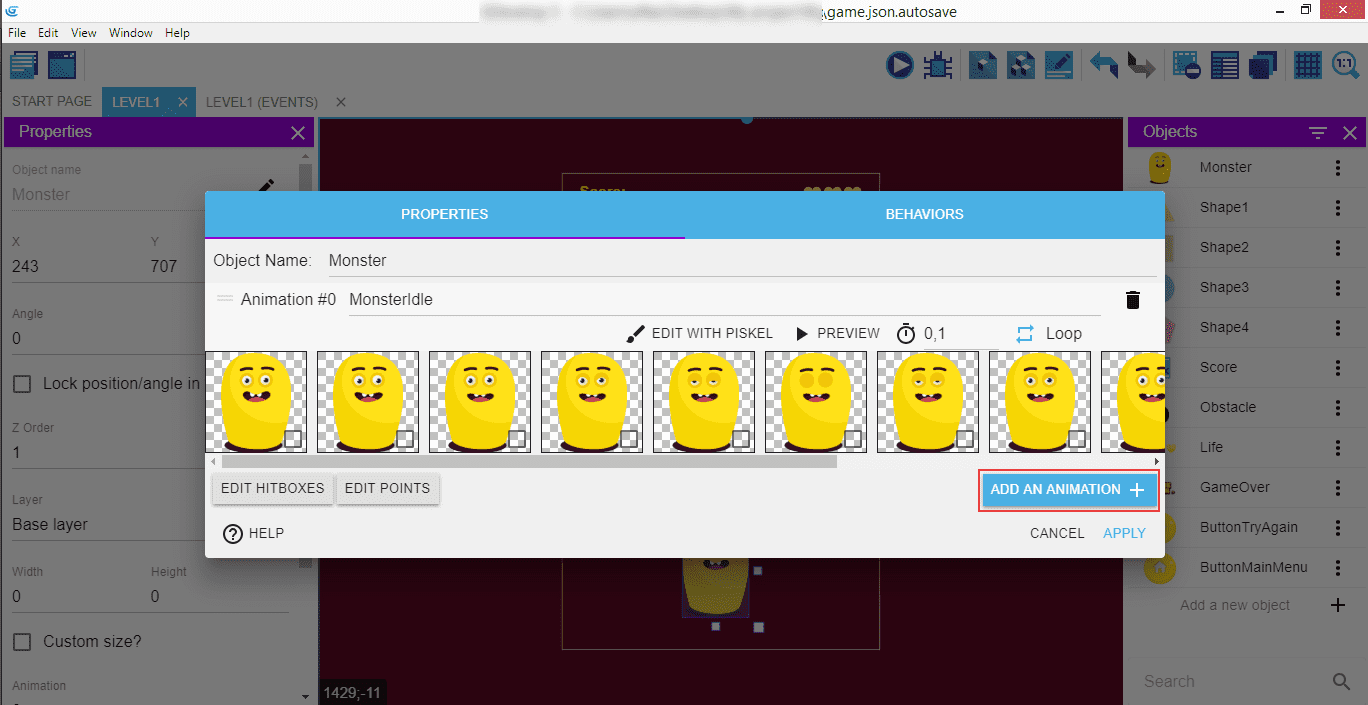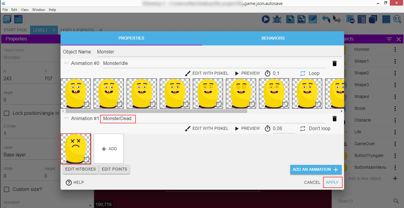 Double-cliquez sur le monstre et ajoutez-lui une deuxième animation (bouton ADD AN ANIMATION).