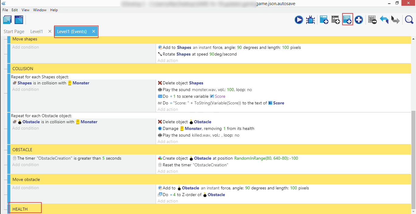 Créez un commentaire Health dans le panneau de l'onglet Level1 (Events).