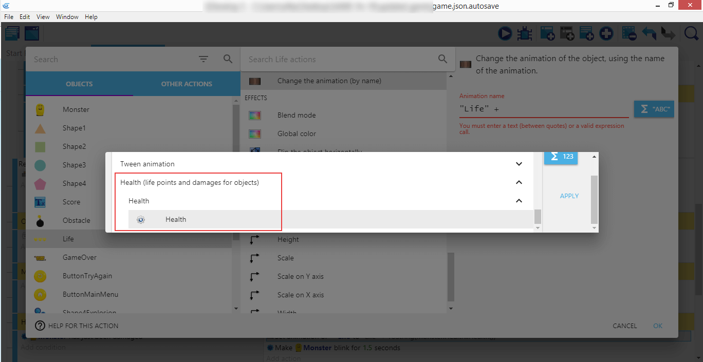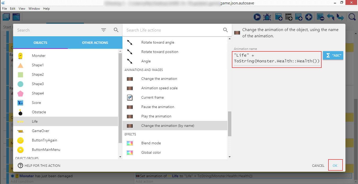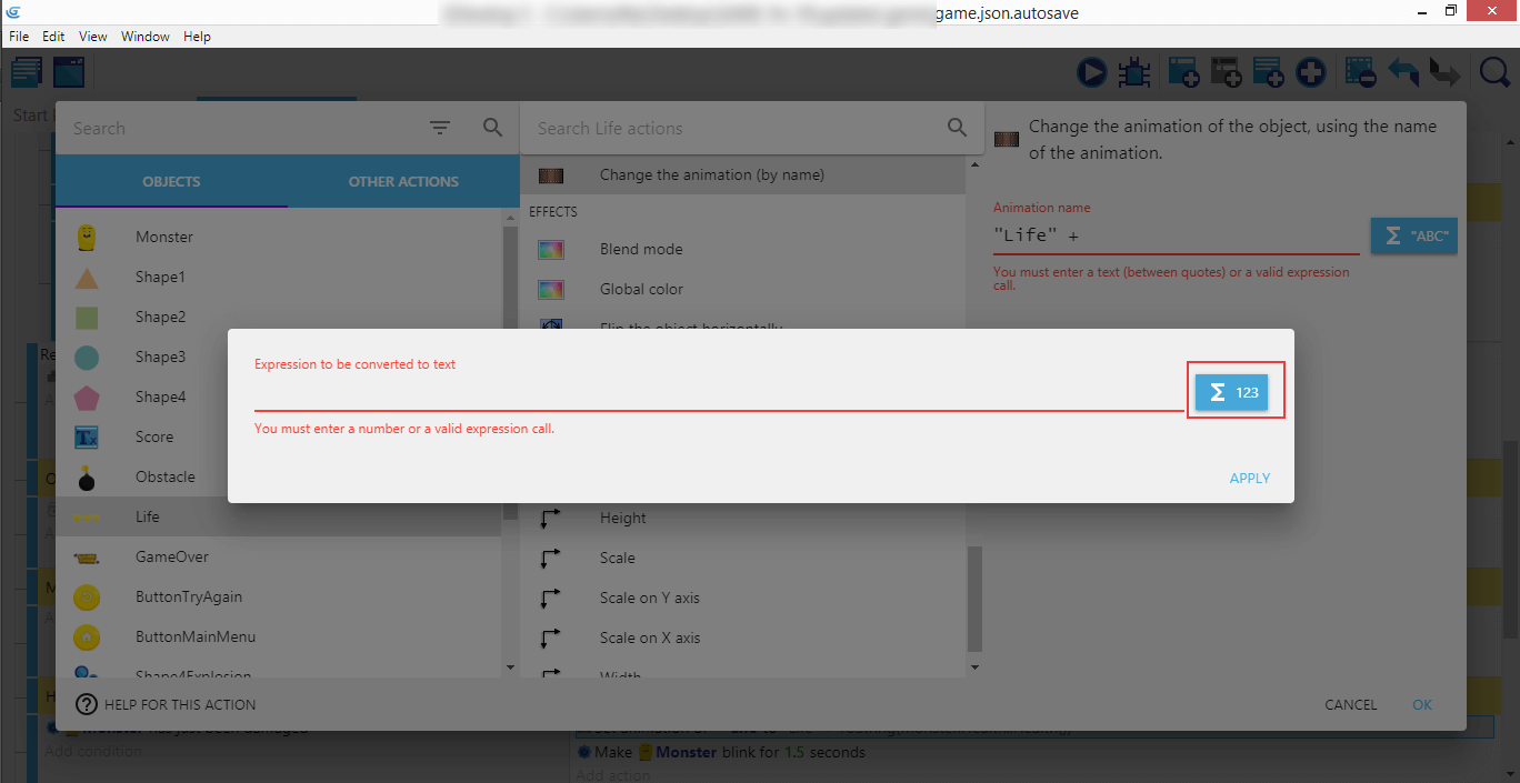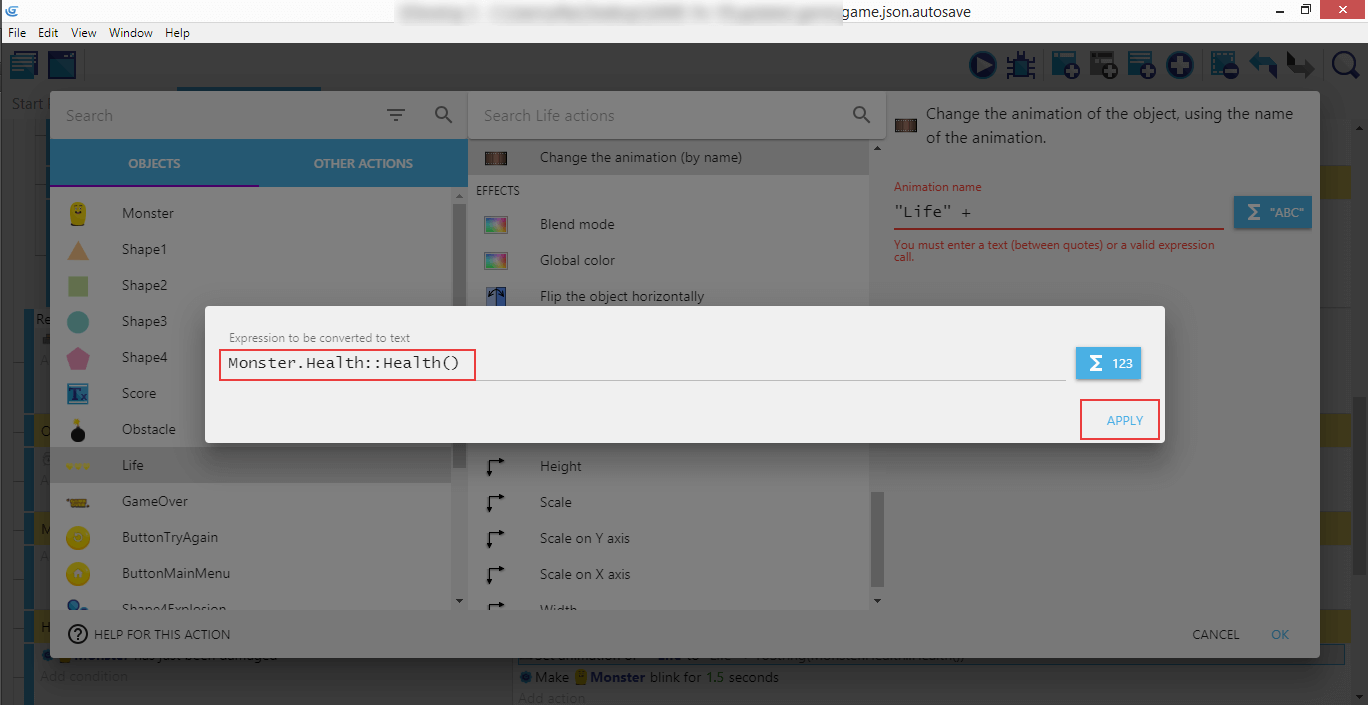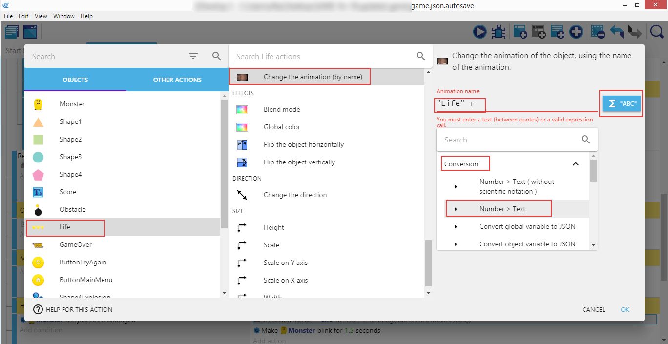 Cliquez ensuite sur Life, Change the animation (by name) (Changer l'animation (par son nom), entrez "Vie" + dans le champ Animation name, puis cliquez sur le bouton ABC à droite. Choisissez Conversion, puis Nombre > Text (parce que nous voulons transformer la santé du joueur, qui est un nombre, en un texte qui sera utilisé pour choisir l'animation à afficher).