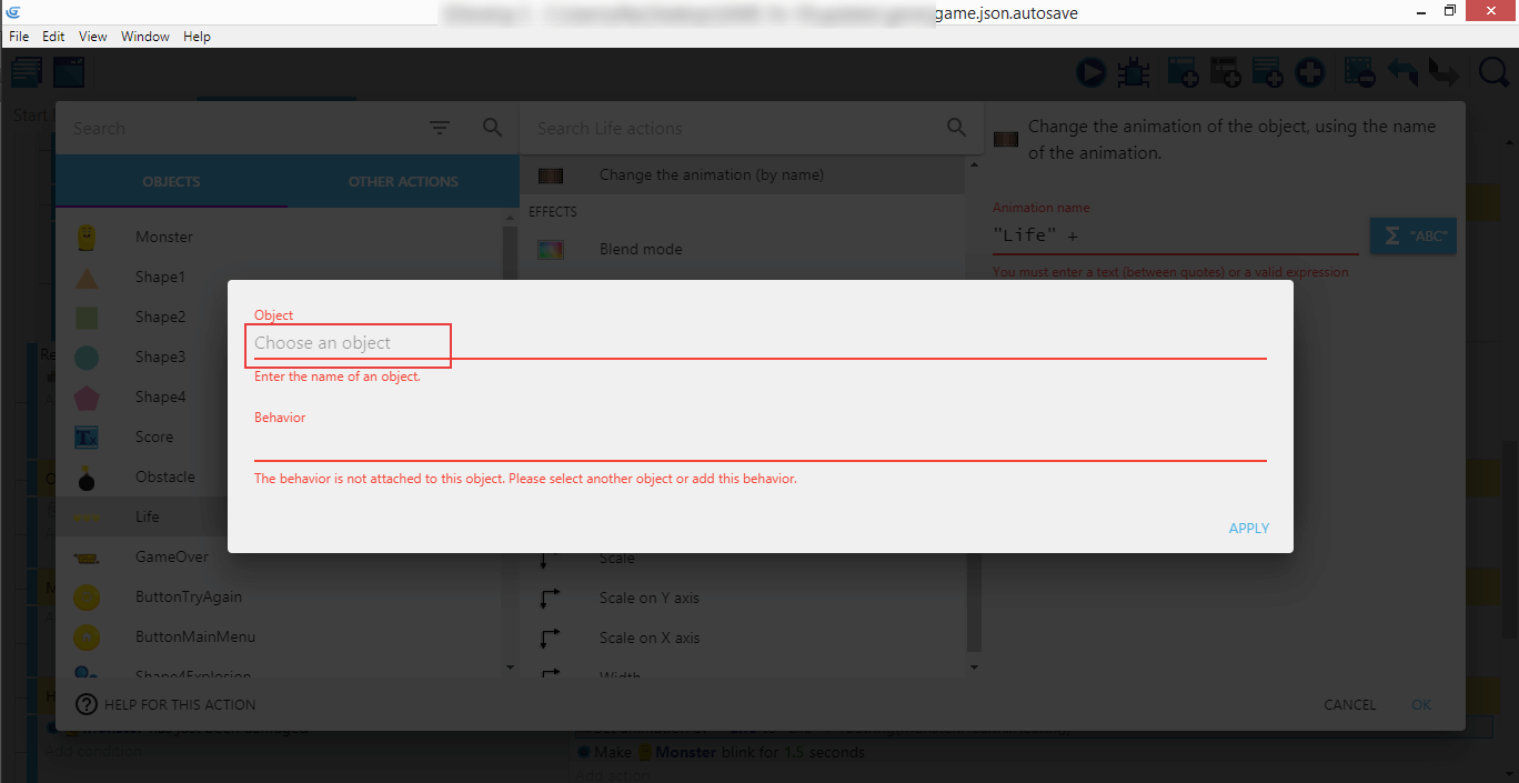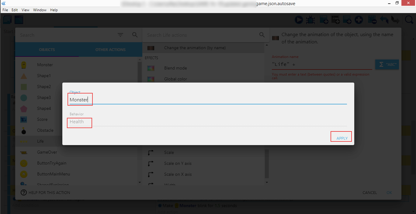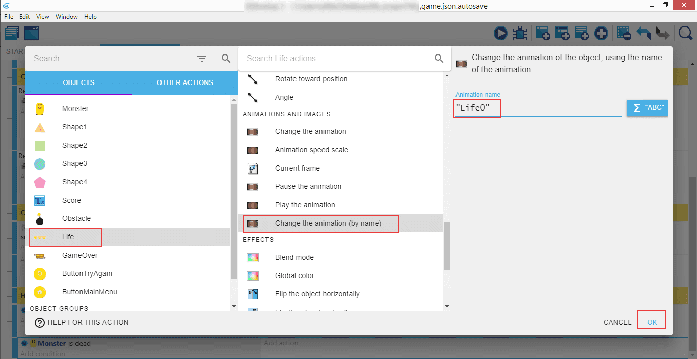 Cliquez Add action. Sélectionnez Life, Change the animation (by name) (Changer l'animation (par son nom)), puis "Life0". Ainsi, quand le monstre meurt, l'image de vie montre qu'il n'y a plus de cœurs disponibles.