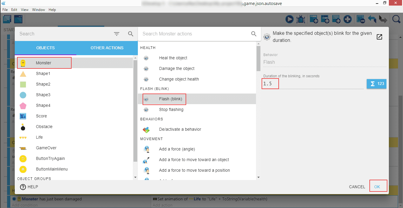 De retour à Monster, recherchez l'action Flash (blink) (Flash (clignotement)), puis réglez la durée du clignotement sur 1,5 secondes, et cliquez OK.
