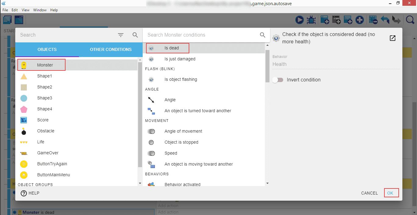Sélectionnez Monster, puis Is dead (Est mort), et OK.
