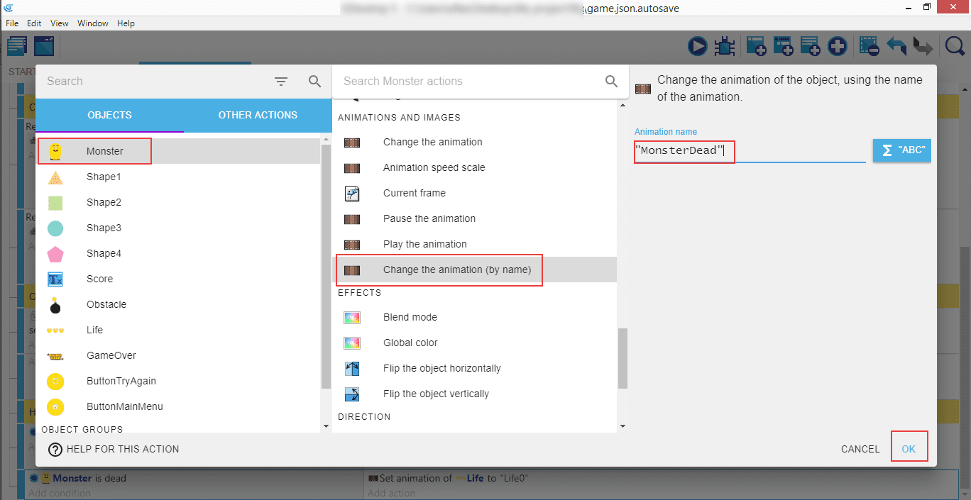 Ajoutez encore une autre action, cette fois pour Monster, puis Change the animation (by name), et MonsterDead. Cela montre l'image du monstre lorsqu'il est à court de vies.