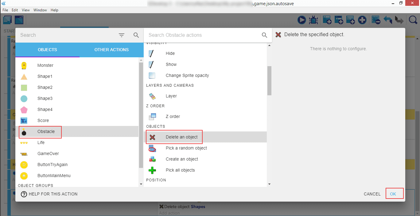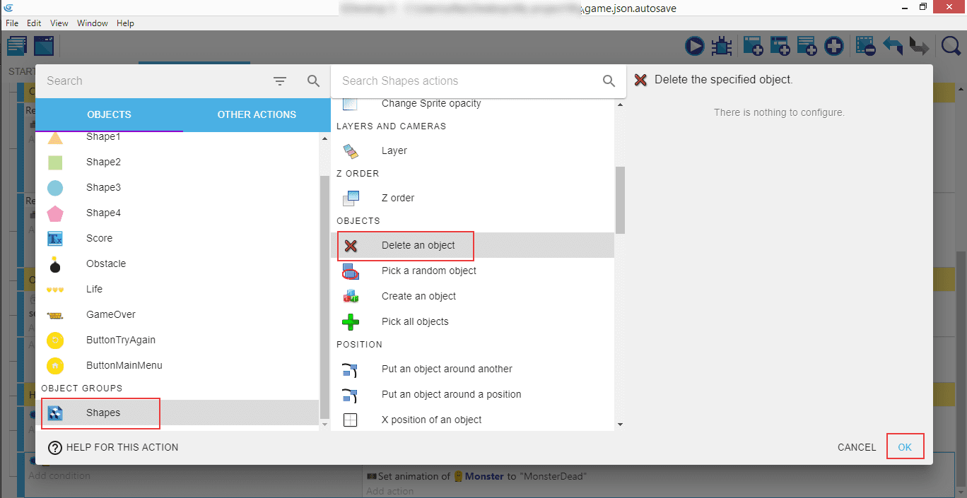 L'action suivante dont nous avons besoin consiste à supprimer le groupe Shapes en en activant Delete an object (Supprimer un objet) ...