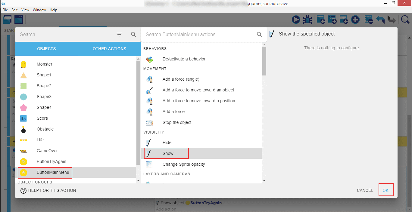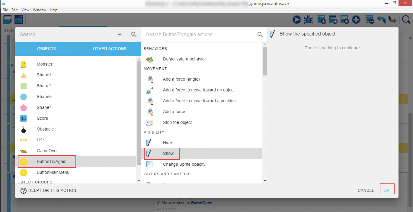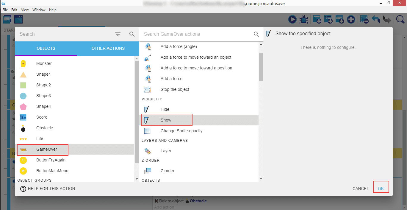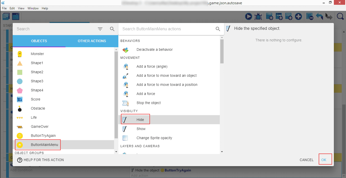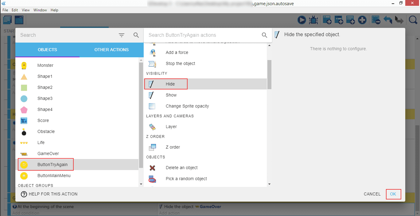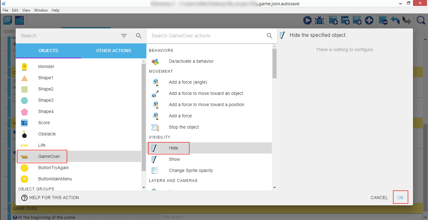 Créez ensuite une action où Hide (Masquer) est appliqué à l'objet GameOver.