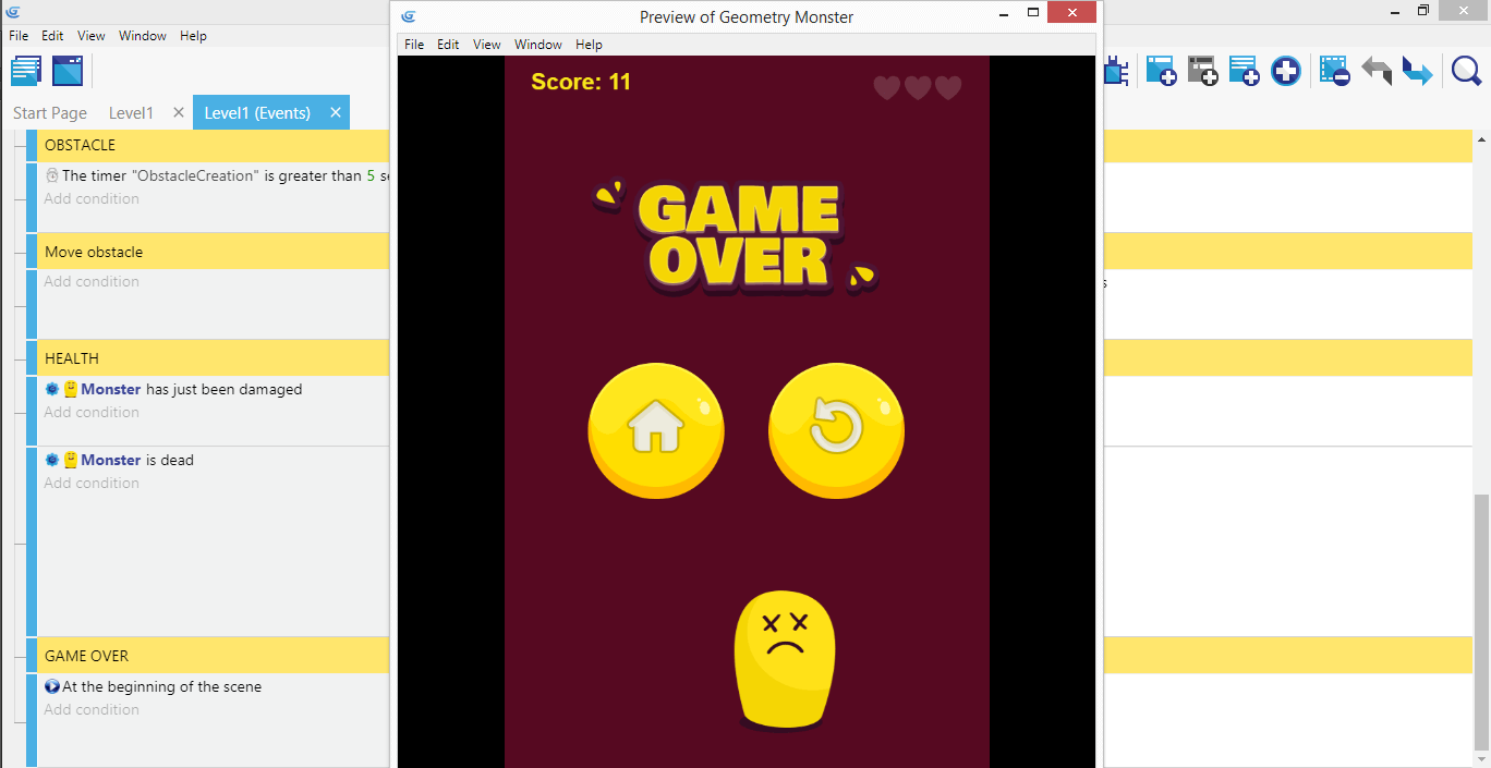De cette façon, lorsque vous lancez le jeu et perdez toutes vos vies, les cœurs sont presque entièrement transparents, les formes et les bombes disparaissent, l'animation de Monster devient inerte et le message "Game Over" est affiché avec le bouton avec une maison et le bouton Réessayez.