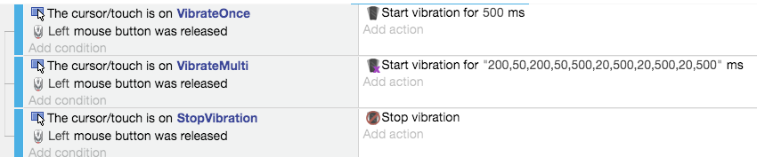 All actions, conditions and expressions are listed in the device vibration reference page.