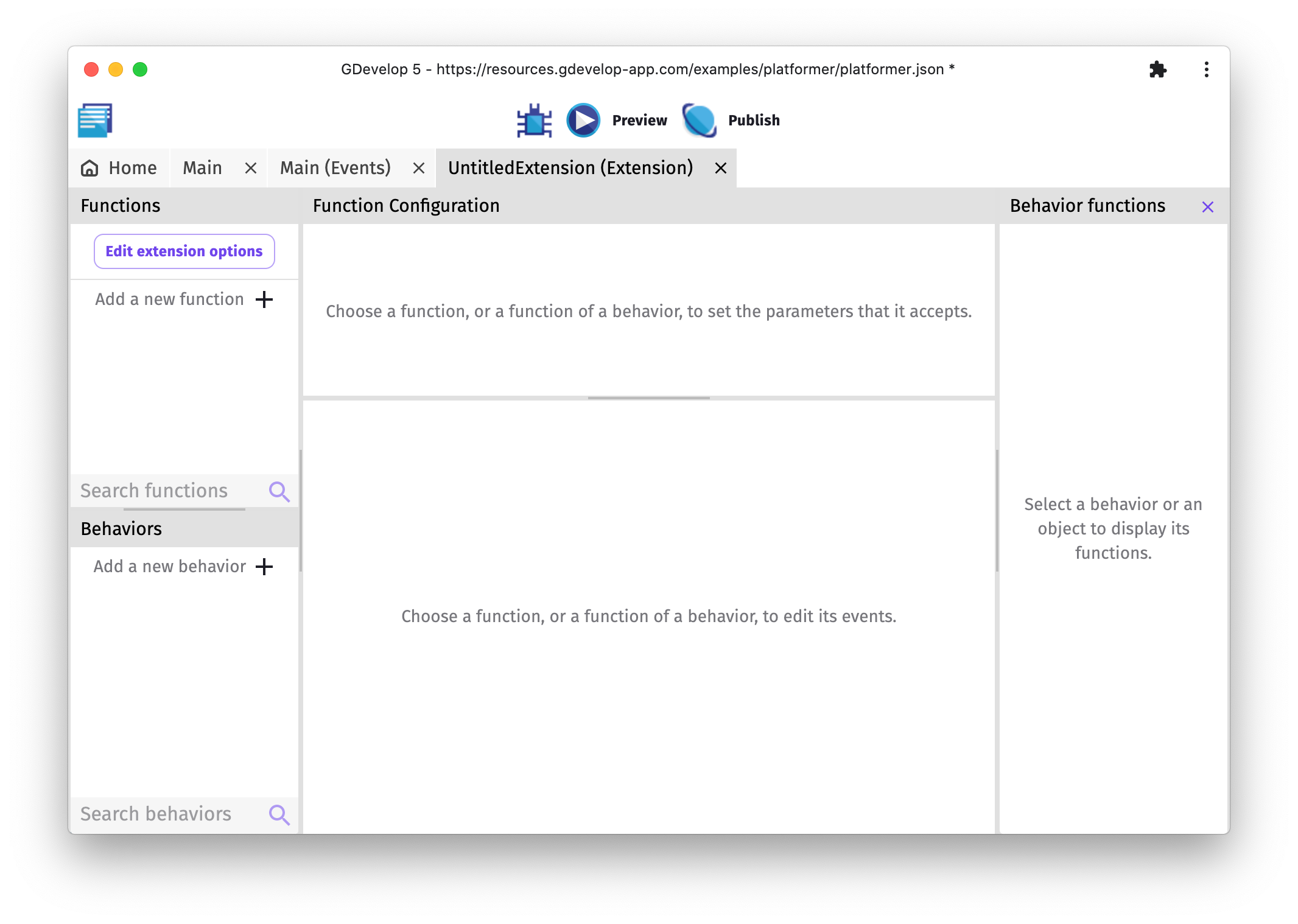 By default, extensions don't have any function. Add one by clicking on Add a new function on the left.