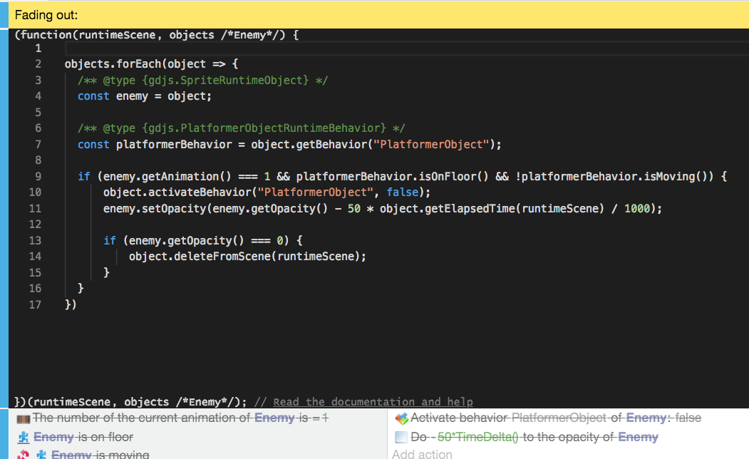 This array is exactly like what an action or a condition would use. For example, the illustration below is an event using a JavaScript event as a sub-event. The JavaScript event will manipulate the enemies that are colliding with the player: