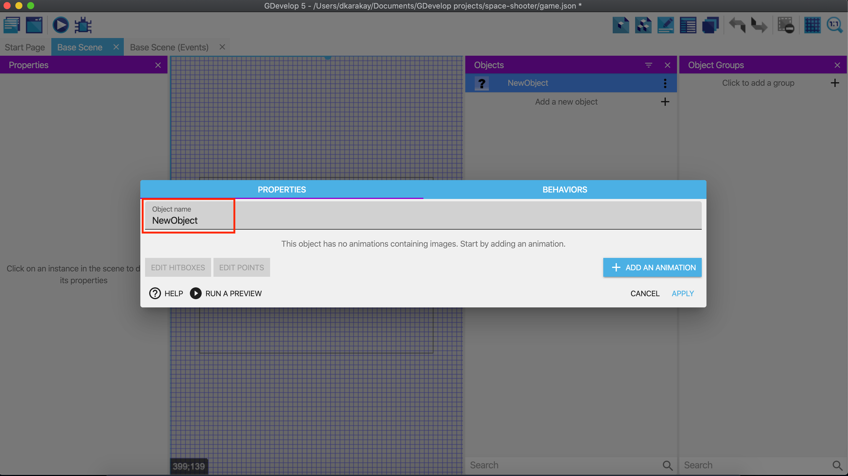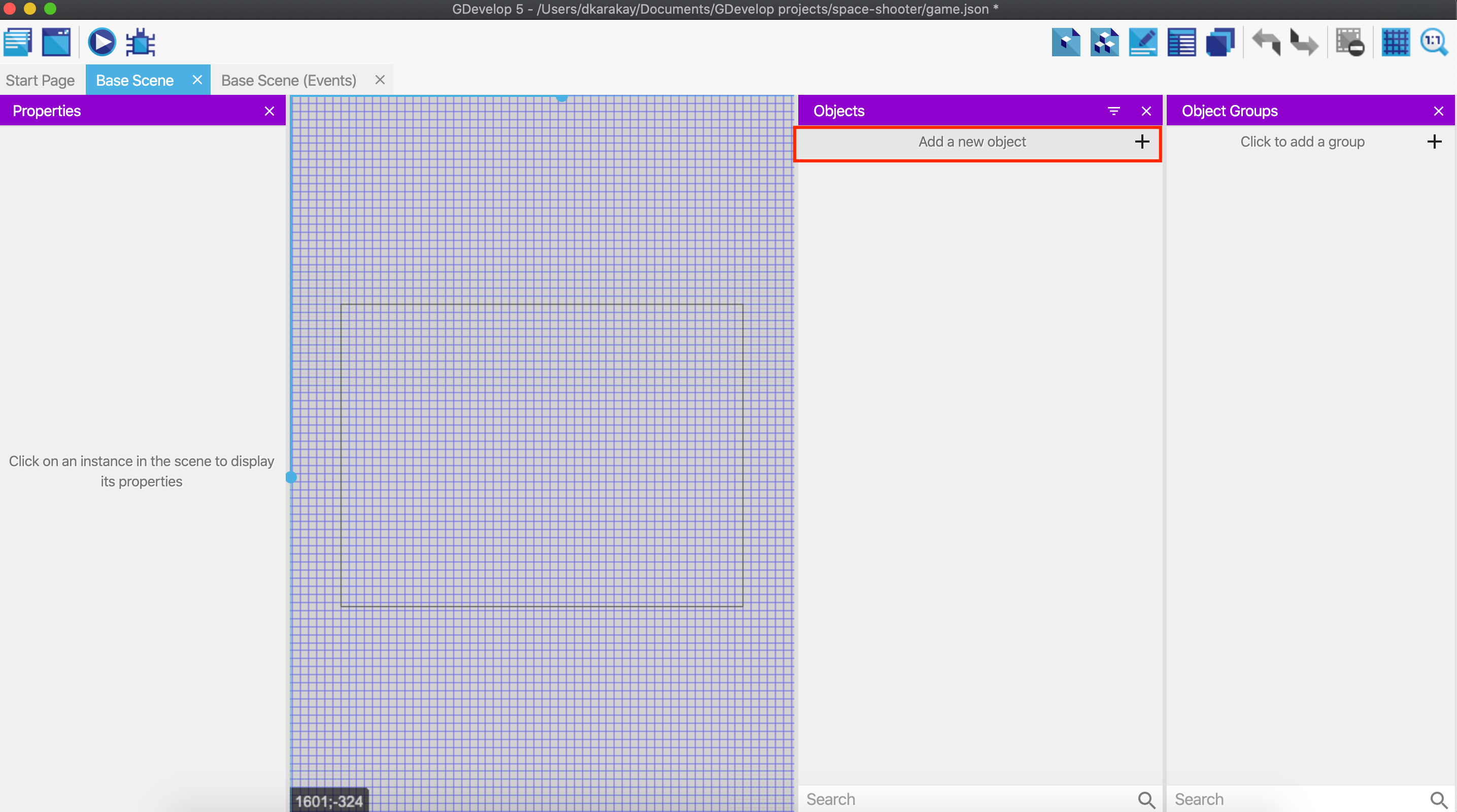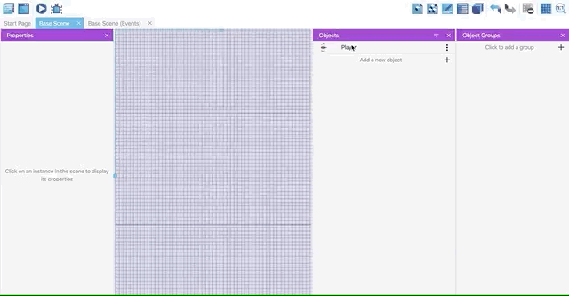 We are ready to add our player (space ship). After downloading the assets from here, we will click the "Add a new object" button.