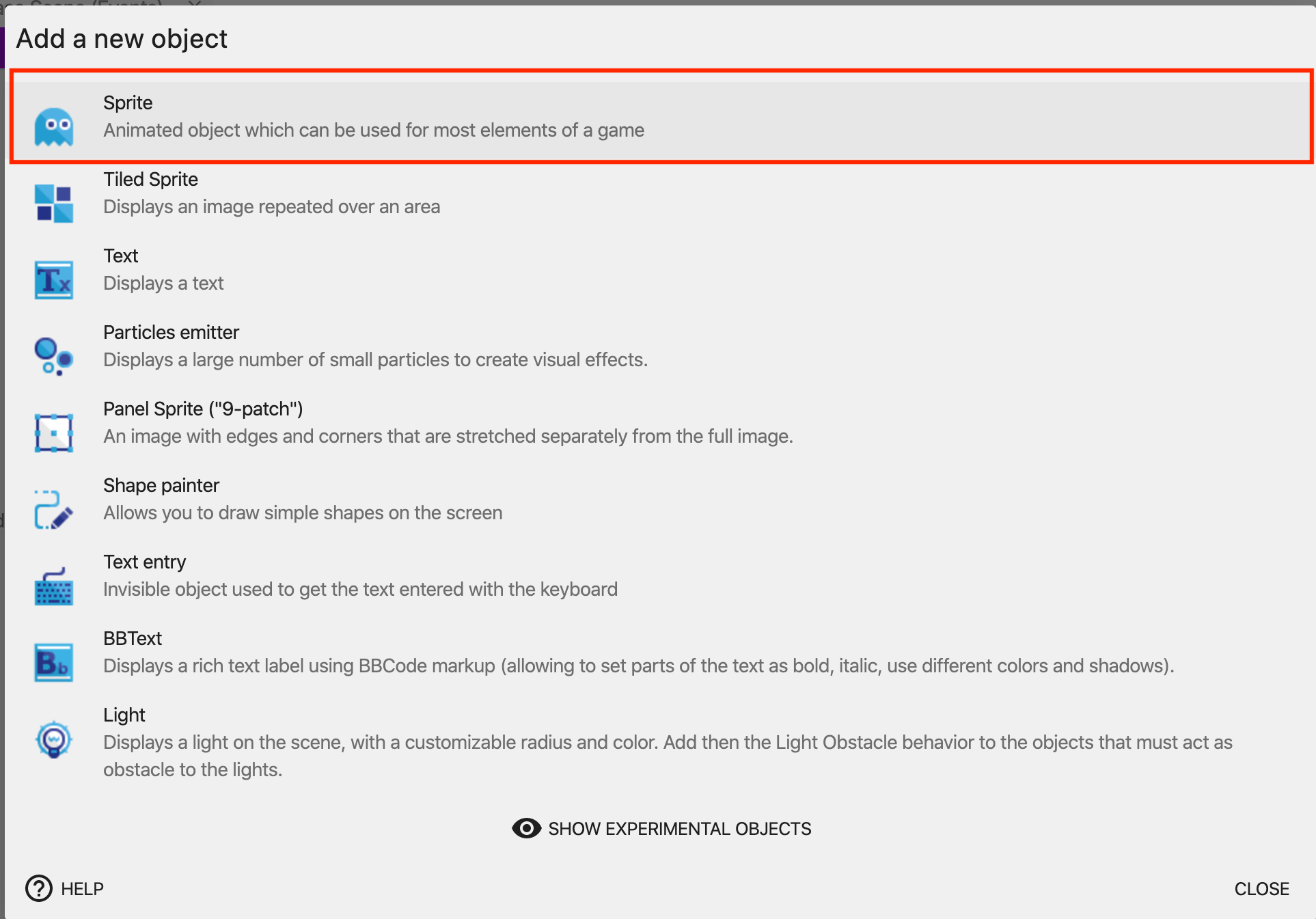 This is a menu for choosing the types of objects. We usually add Sprites as an object. Sprites allow us to add images. However, we will use different types of objects in the following parts. Now, select Sprite.