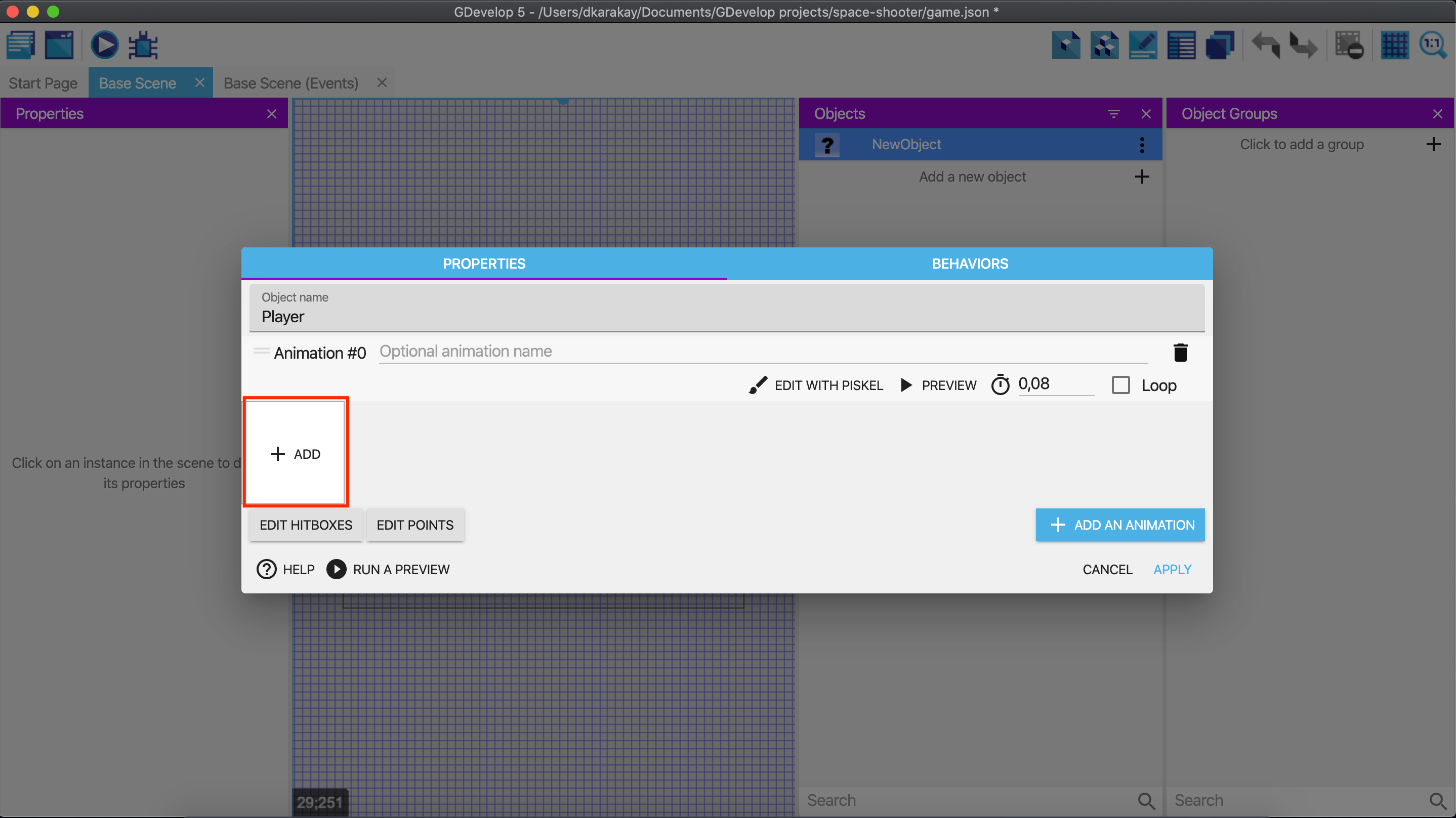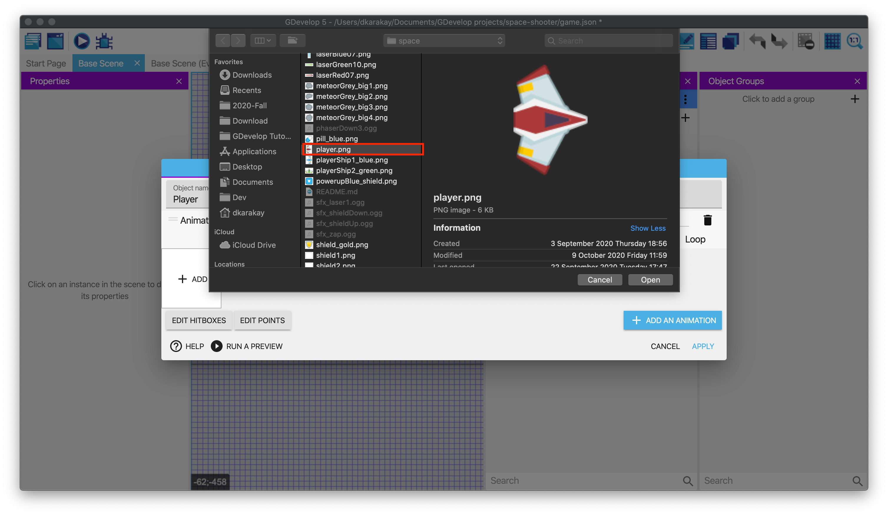 We will select our player image. Select player.png in the downloaded assets folder. Then, click Apply.