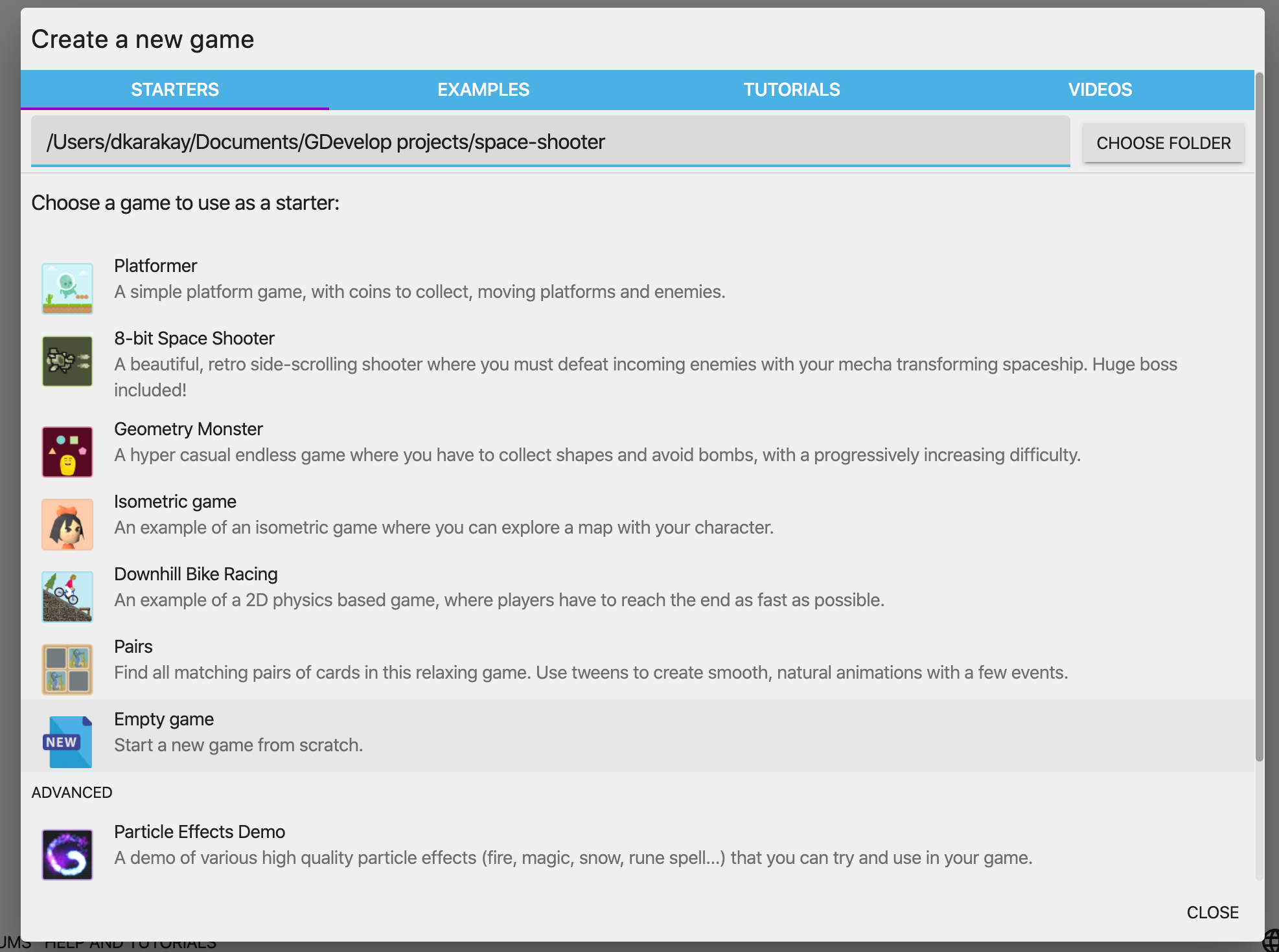 In the next window, choose a folder for your project and select Empty project to start a new game from scratch.