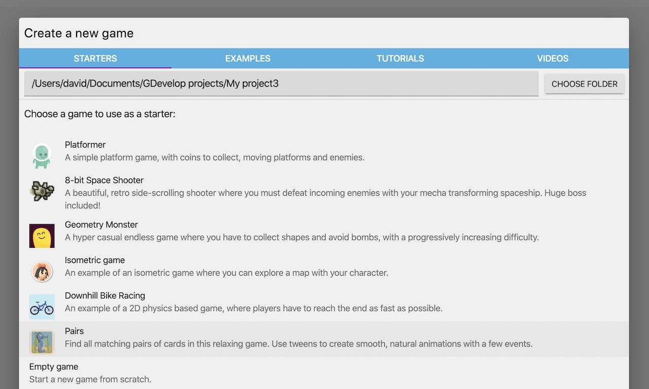 1. Launch GDevelop. 2. Click Create a new project. 3. Choose a location for the project. 4. Select one of the projects from the Starters tab, such as Platformer or 8-bit Space Shooter, or start a game from scratch by selecting the Empty project.