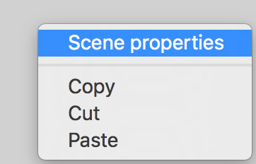 グレーの背景は少し退屈です。後で画像を追加できますが、今のところは、物事をシンプルにしましょう。エディターで、グレーの背景を右クリックし、「シーンのプロパティ」を選択します。