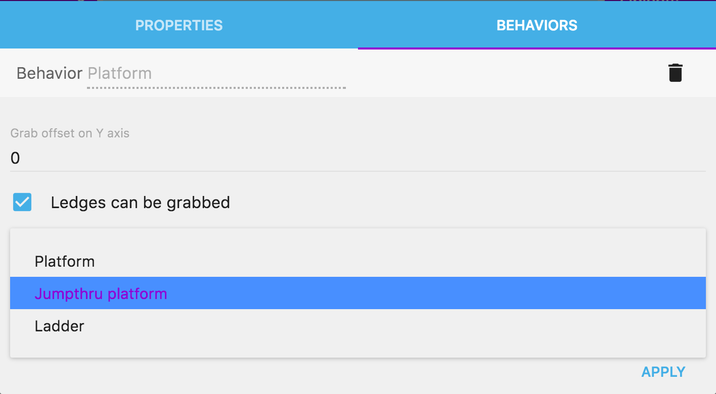現時点では、オブジェクトはブロックと見なされていません。オブジェクトエディタを開き、ビヘイビアタブに切り替えます。プラットフォームと呼ばれるビヘイビアを追加します。最後に、「タイプ」フィールドをクリックしたときにリストで「ジャンプスループラットフォーム」を選択します。