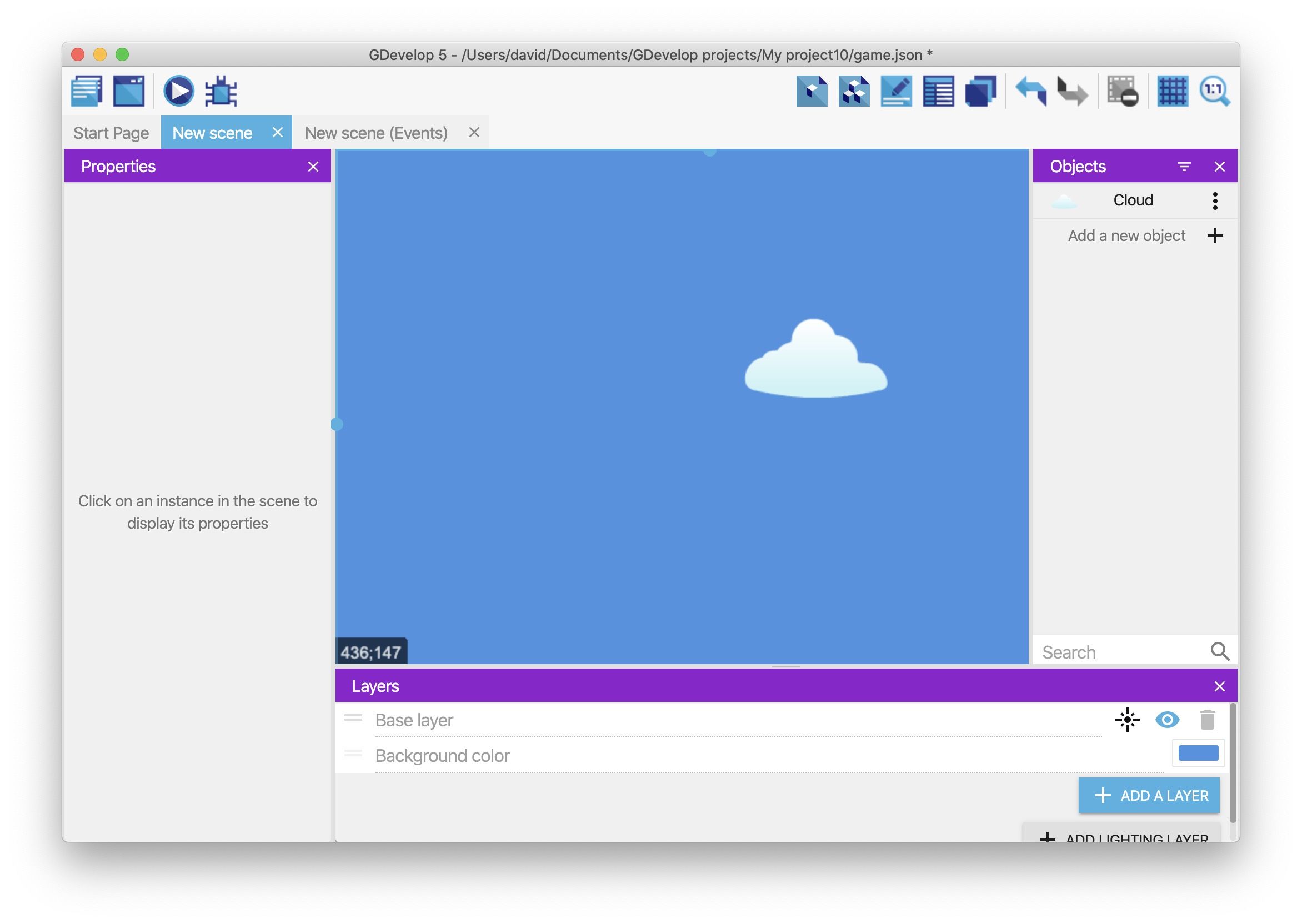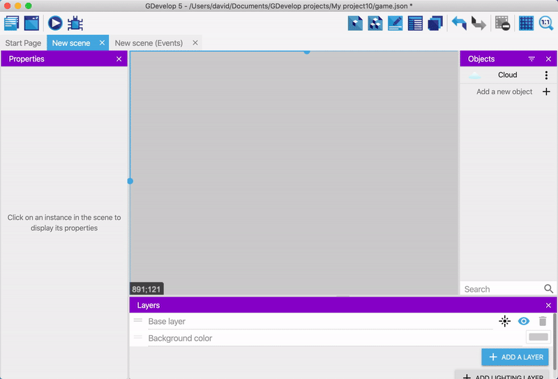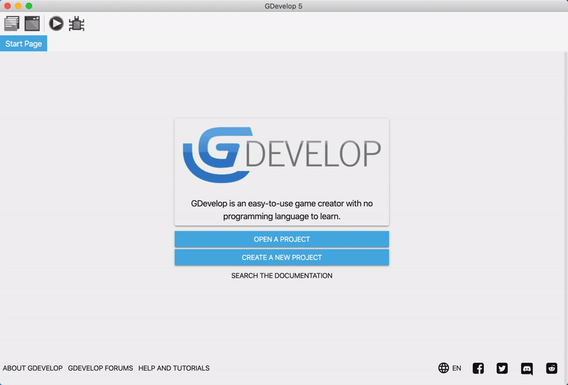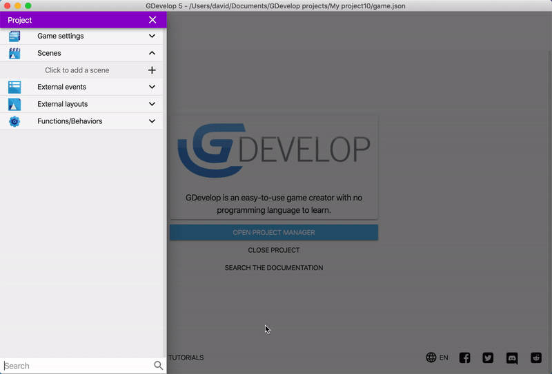 GDevelop では、_プロジェクト_がゲームのアセットやロジックの容れ物になります。このチュートリアルで「プロジェクト」といえば、だいたい「ゲーム」と同じ意味だと思ってください。